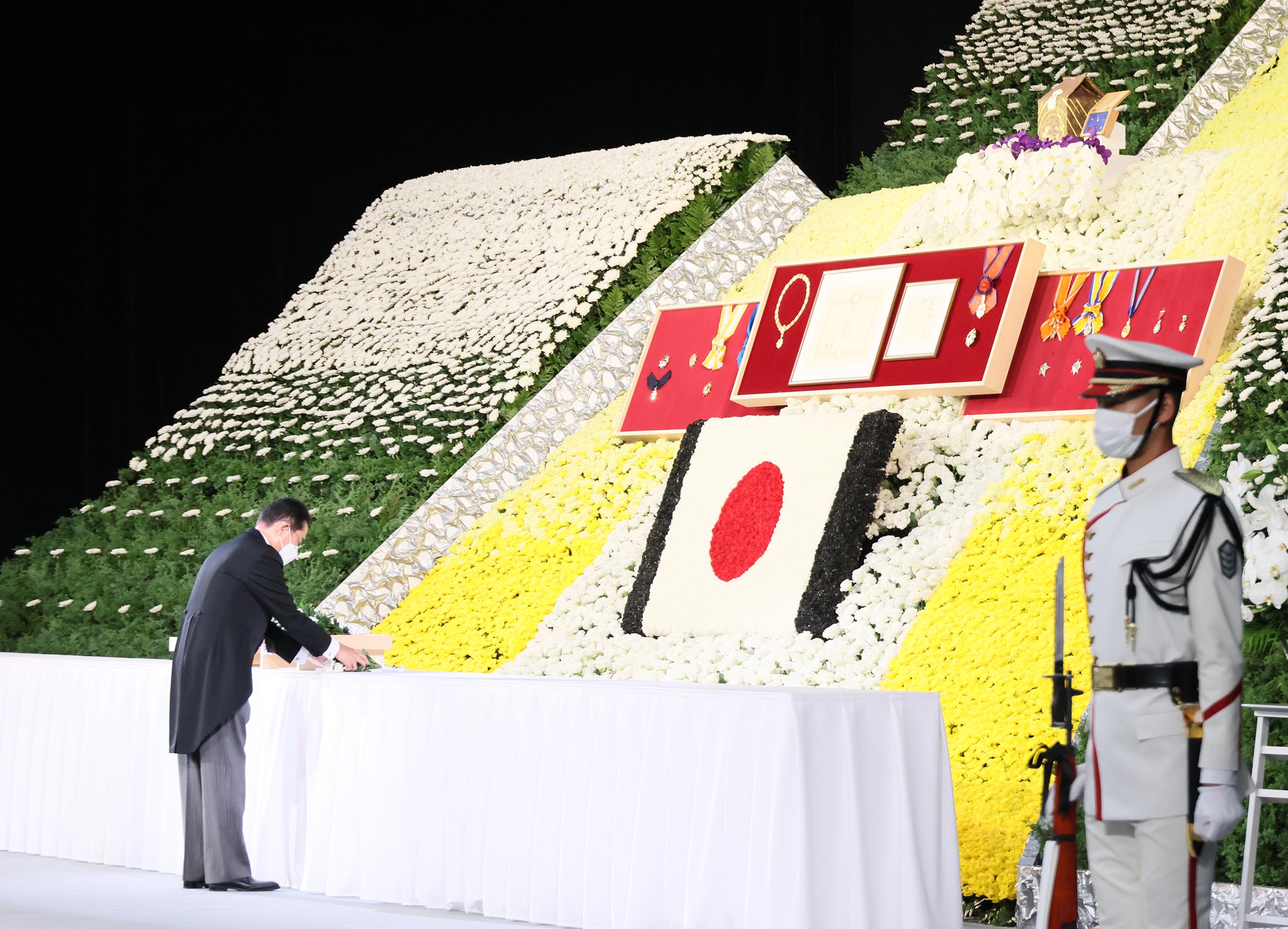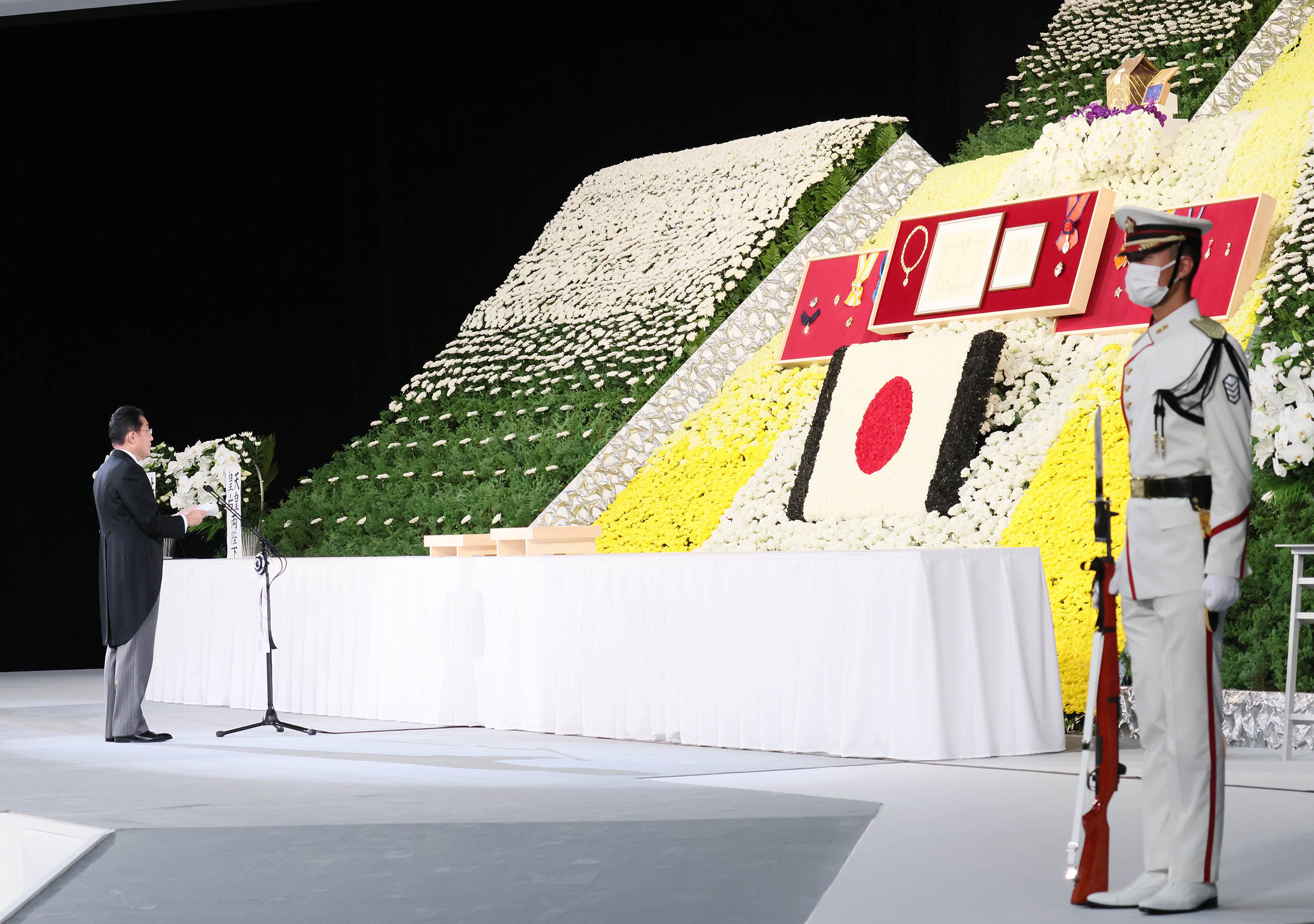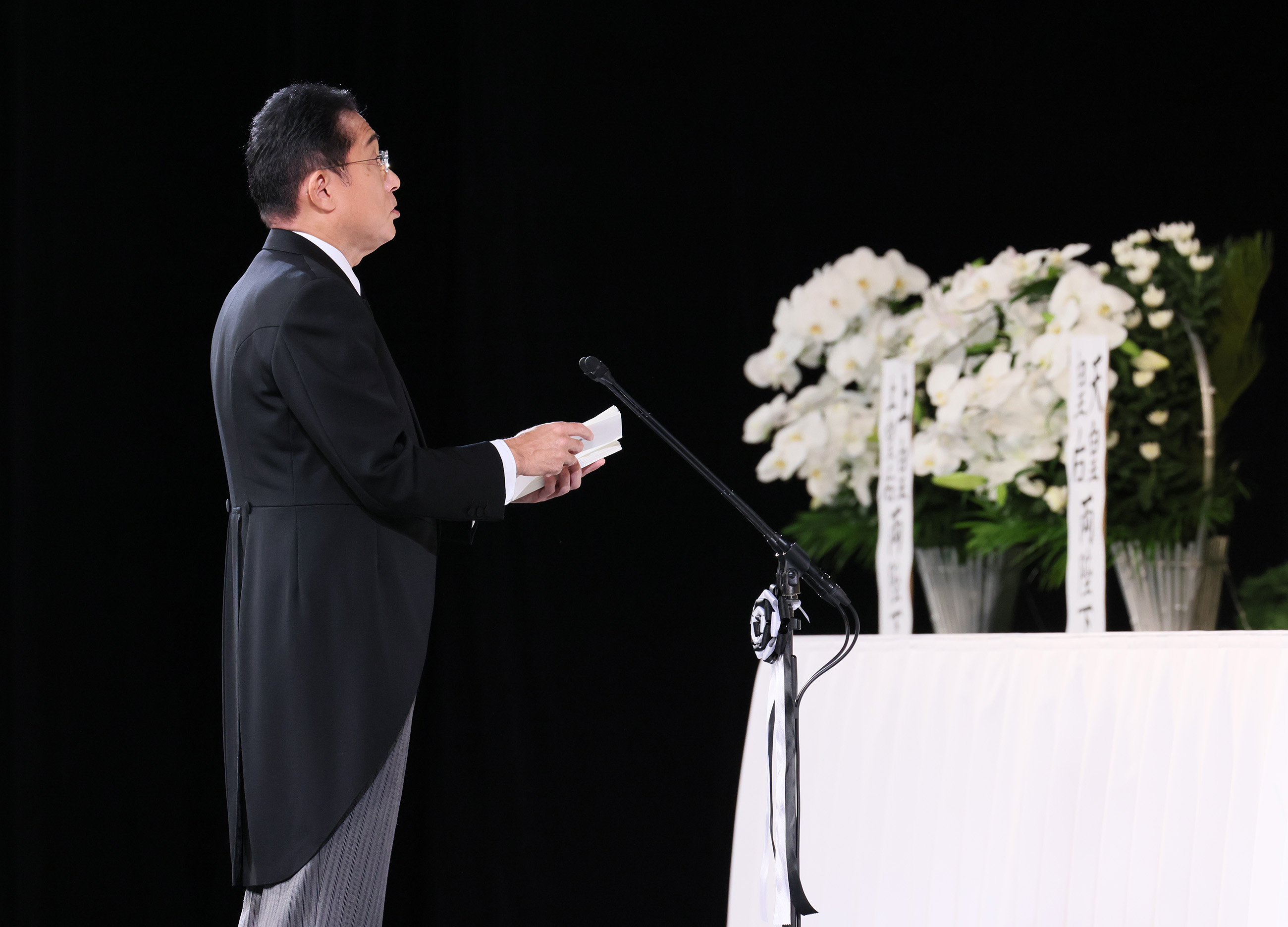 从一位、大勋位菊花章颈饰之安倍晋三前首相的国葬典礼于今日举行,本人在此谨代表政府献上悼词。
