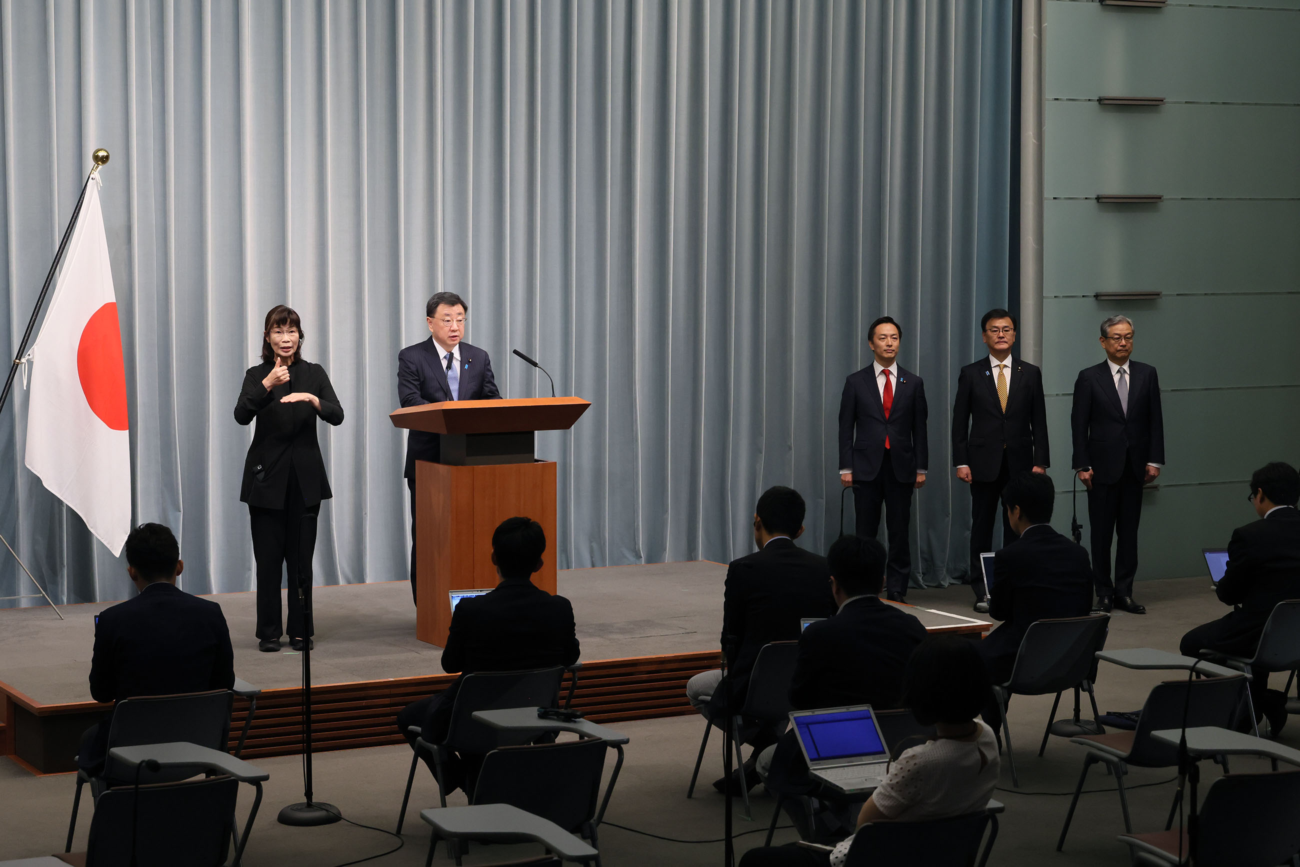 第二届岸田内阁第二次改组内阁启动 2023年 9月 13日 (周三) 发推 (暂译) 2023年9月13日,岸田首相进行了第二届岸田内阁成立后的第二次内阁改组。 在临时内阁会议上汇总阁僚的辞呈后,岸田首相与公明党党首山口那津男举行执政党党首会谈,内阁官房长官松野博一公布了阁僚名单。接着在皇宫举行新任国务大臣认证仪式,第二届岸田内阁第二次改组内阁正式启动。 随后,岸田首相就内阁改组举行记者招待会,然后召开了首次内阁会议并合影留念。 更多